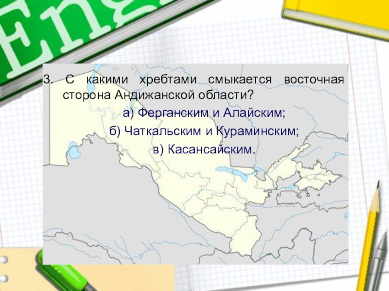 3. С какими хребтами смыкается восточная сторона Андижанской области?	а) Ферганским и Алайским;	б) Чаткальским и Кураминским;	в) Касансайским.