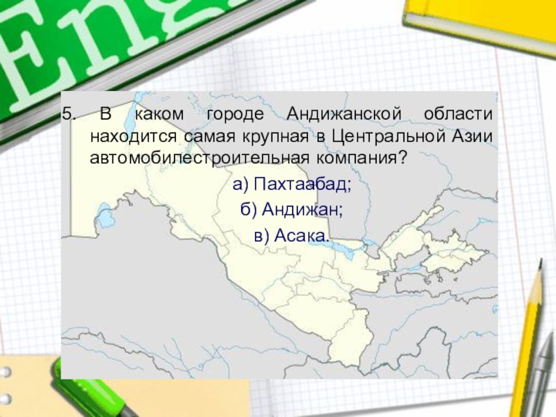 5. В каком городе Андижанской области находится самая крупная в Центральной Азии автомобилестроительная компания? 	а) Пахтаабад;	б) Андижан;	в)