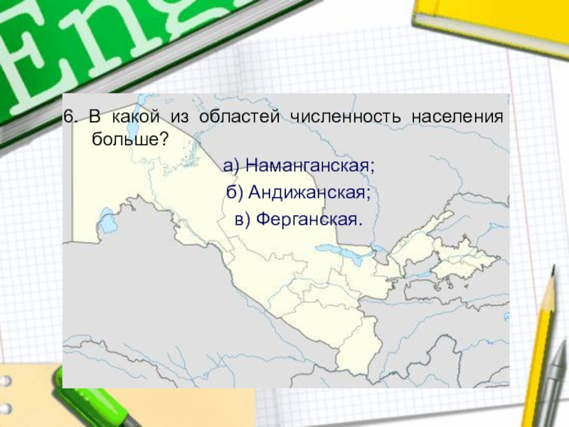 6. В какой из областей численность населения больше?	а) Наманганская;	б) Андижанская;	в) Ферганская.