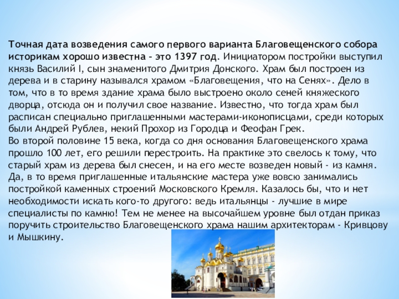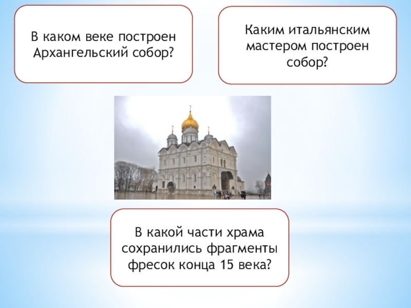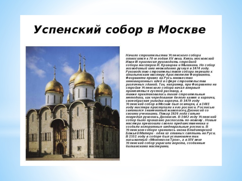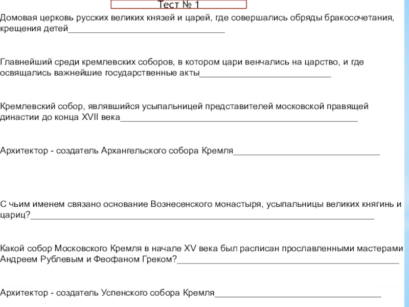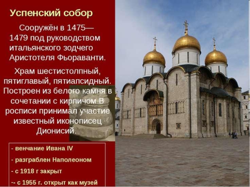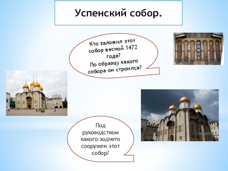 3. Узнайте, для чего предназначались: Успенский собор, Благовещенский собор, Грановитая палата, Архангельский собор, колокольня Ивана Великого.