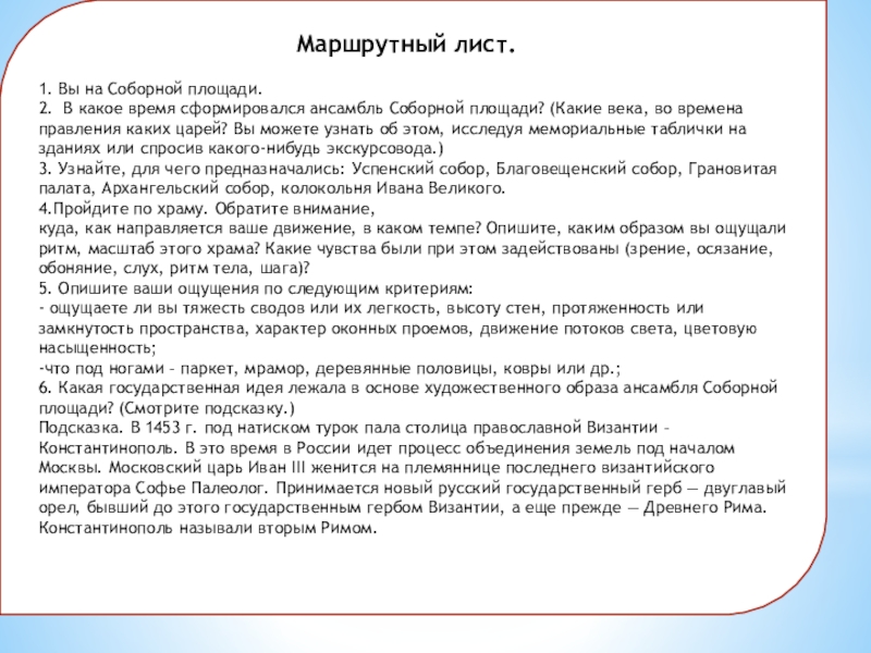 6. Какая государственная идея лежала в основе художественного образа ансамбля Соборной площади? (Смотрите подсказку.)