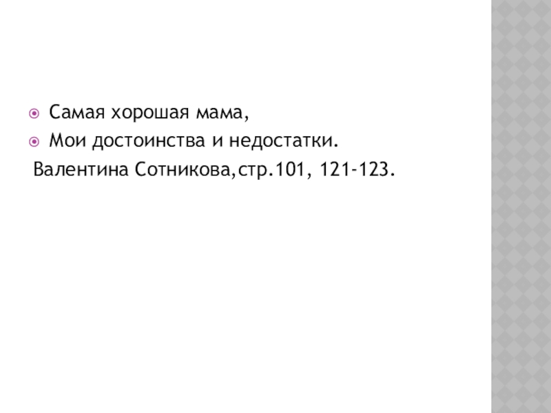 Самая хорошая мама,Мои достоинства и недостатки.Валентина Сотникова,стр.101, 121-123.