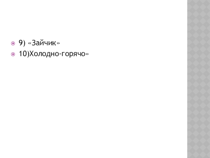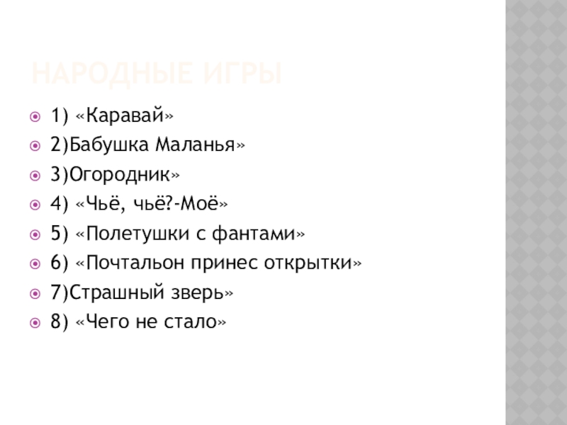 Народные игры1) «Каравай»2)Бабушка Маланья»3)Огородник»4) «Чьё, чьё?-Моё»5) «Полетушки с фантами»6) «Почтальон принес открытки»7)Страшный зверь»8) «Чего не стало»