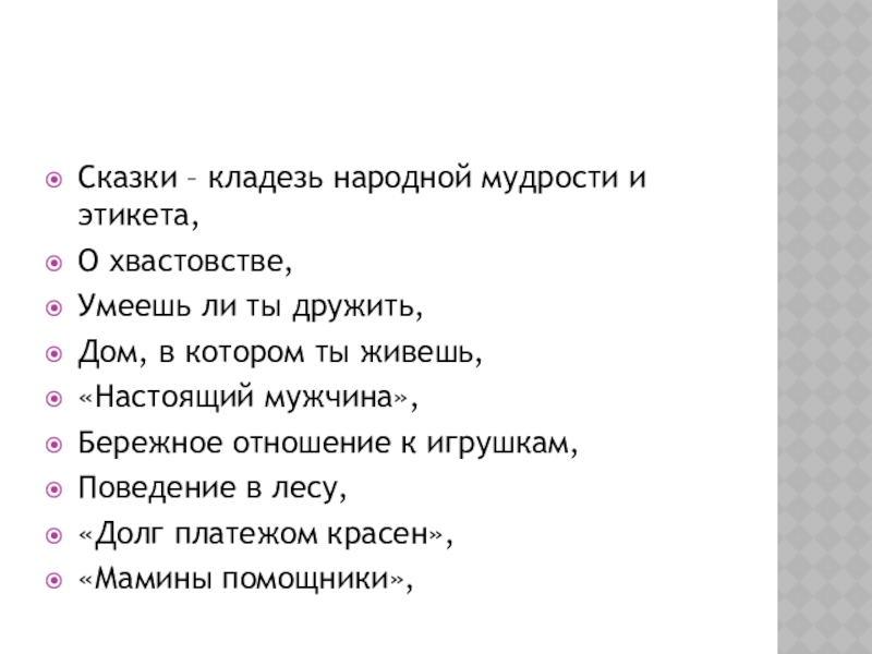 Сказки – кладезь народной мудрости и этикета,О хвастовстве,Умеешь ли ты дружить,Дом, в котором ты живешь,«Настоящий мужчина»,Бережное отношение