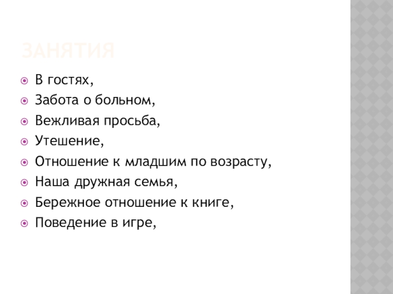 ЗАНЯТИЯВ гостях,Забота о больном,Вежливая просьба,Утешение,Отношение к младшим по возрасту,Наша дружная семья,Бережное отношение к книге,Поведение в игре,