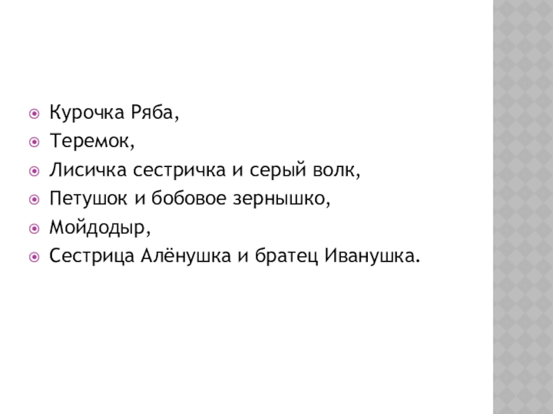 Курочка Ряба,Теремок,Лисичка сестричка и серый волк,Петушок и бобовое зернышко,Мойдодыр,Сестрица Алёнушка и братец Иванушка.