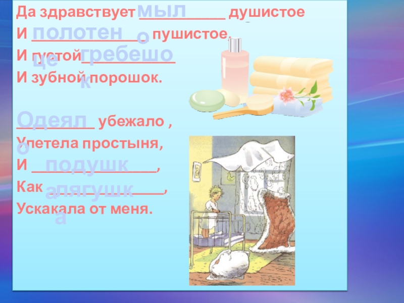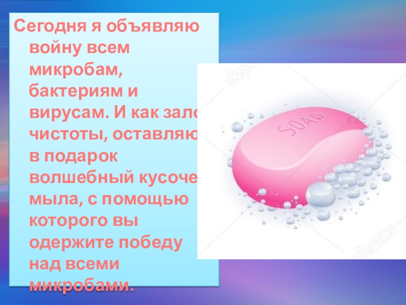 залог чистоты, оставляю в подарок волшебный кусочек мыла, с помощью которого вы одержите победу над всеми микробами.