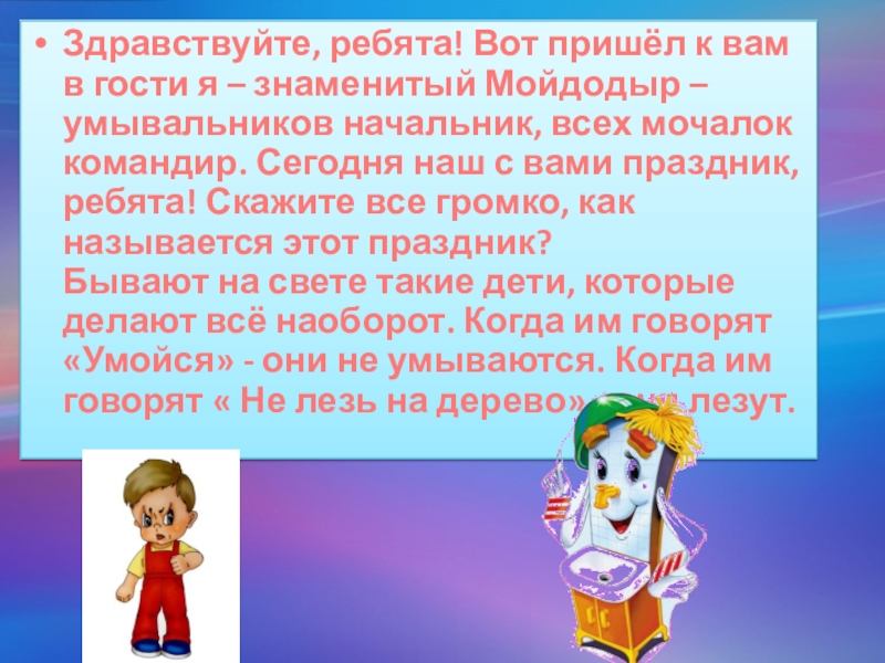 Мойдодыр – умывальников начальник, всех мочалок командир. Сегодня наш с вами праздник, ребята! Скажите все громко, как называется этот праздник?