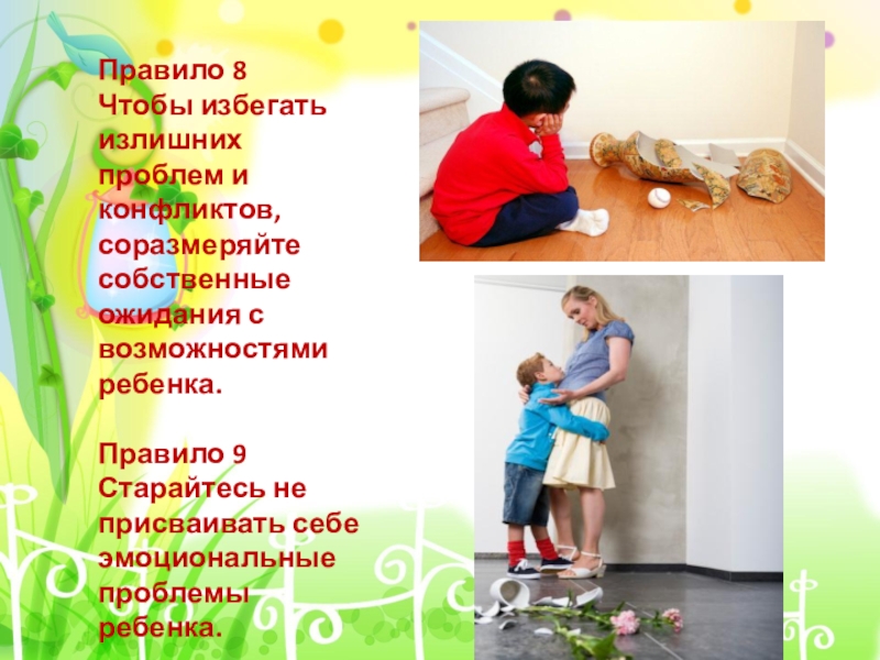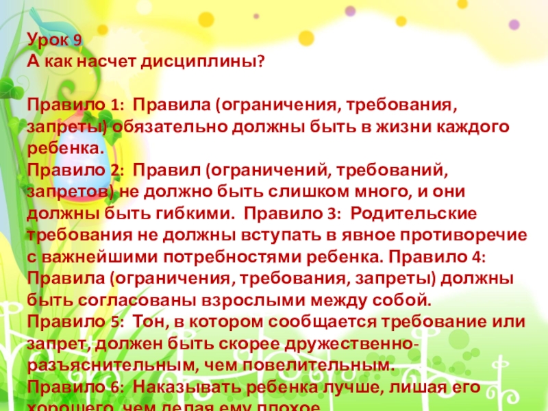 Правило 2: Правил (ограничений, требований, запретов) не должно быть слишком много, и они должны быть гибкими. Правило 3: Родительские требования не должны вступать в явное противоречие с важнейшими потребностями ребенка. Правило 4: Правила (ограничения, требования, запреты) должны быть согласованы взрослыми между собой.