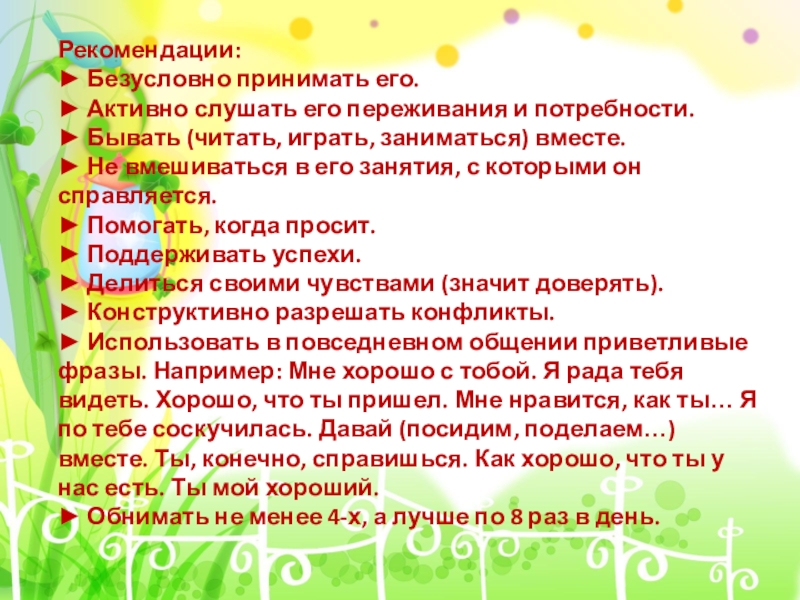 ► Использовать в повседневном общении приветливые фразы. Например: Мне хорошо с тобой. Я рада тебя видеть. Хорошо, что ты пришел. Мне нравится, как ты… Я по тебе соскучилась. Давай (посидим, поделаем…) вместе. Ты, конечно, справишься. Как хорошо, что ты у нас есть. Ты мой хороший.