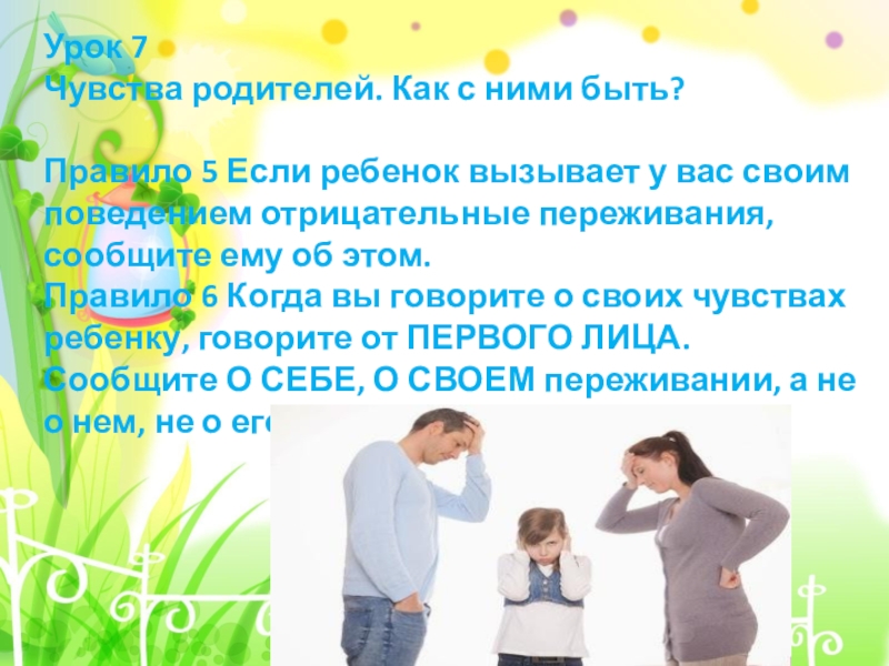 Правило 6 Когда вы говорите о своих чувствах ребенку, говорите от ПЕРВОГО ЛИЦА. Сообщите О СЕБЕ, О СВОЕМ переживании, а не о нем, не о его поведении.