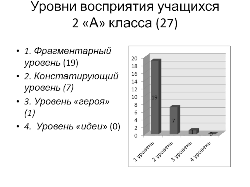 Уровни восприятия учащихся  2 «А» класса (27) 1. Фрагментарный уровень (19)2. Констатирующий уровень (7)3. Уровень «героя»