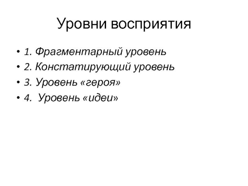 Уровни восприятия1. Фрагментарный уровень 2. Констатирующий уровень 3. Уровень «героя»4.  Уровень «идеи»