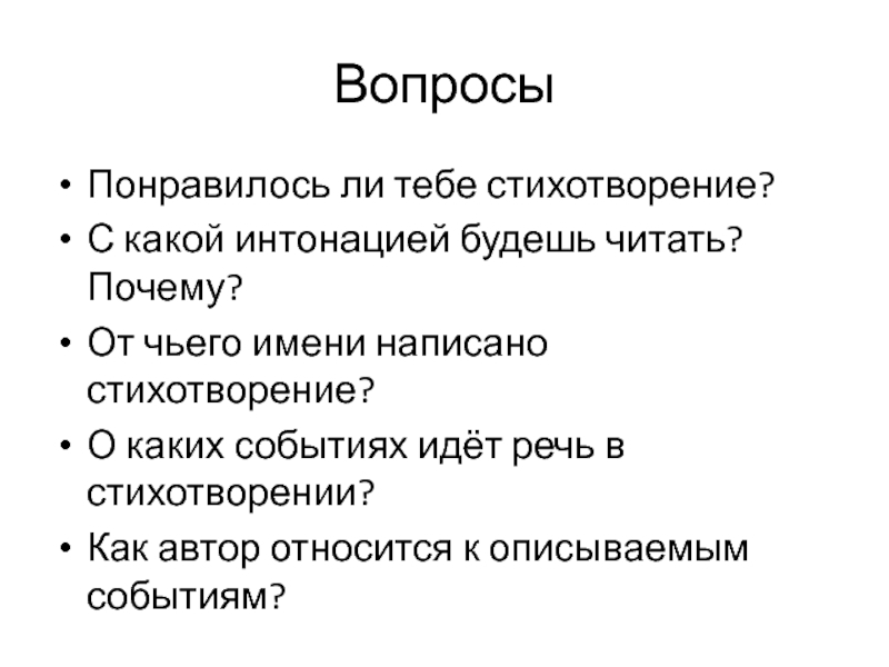ВопросыПонравилось ли тебе стихотворение?С какой интонацией будешь читать? Почему?От чьего имени написано стихотворение?О каких событиях идёт речь