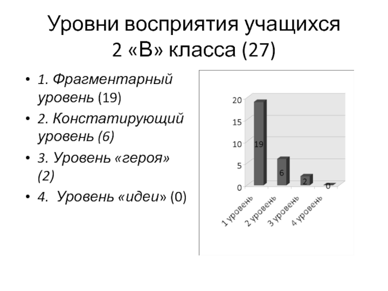 Уровни восприятия учащихся  2 «В» класса (27)1. Фрагментарный уровень (19)2. Констатирующий уровень (6)3. Уровень «героя» (2)4.