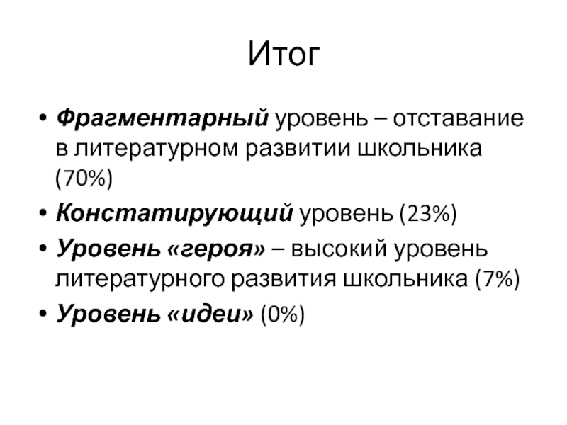 Итог Фрагментарный уровень – отставание в литературном развитии школьника (70%)Констатирующий уровень (23%)Уровень «героя» – высокий уровень литературного