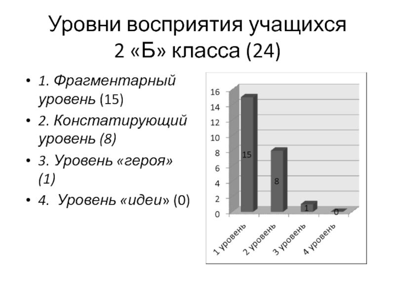 Уровни восприятия учащихся  2 «Б» класса (24)1. Фрагментарный уровень (15)2. Констатирующий уровень (8)3. Уровень «героя» (1)4.