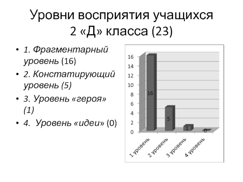 Уровни восприятия учащихся  2 «Д» класса (23)1. Фрагментарный уровень (16)2. Констатирующий уровень (5)3. Уровень «героя» (1)4.