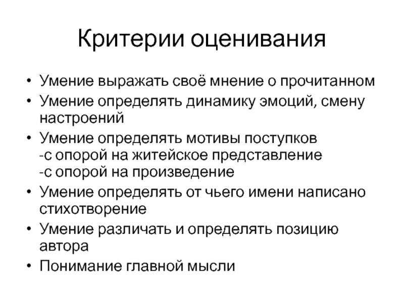 Критерии оцениванияУмение выражать своё мнение о прочитанномУмение определять динамику эмоций, смену настроенийУмение определять мотивы поступков -с опорой