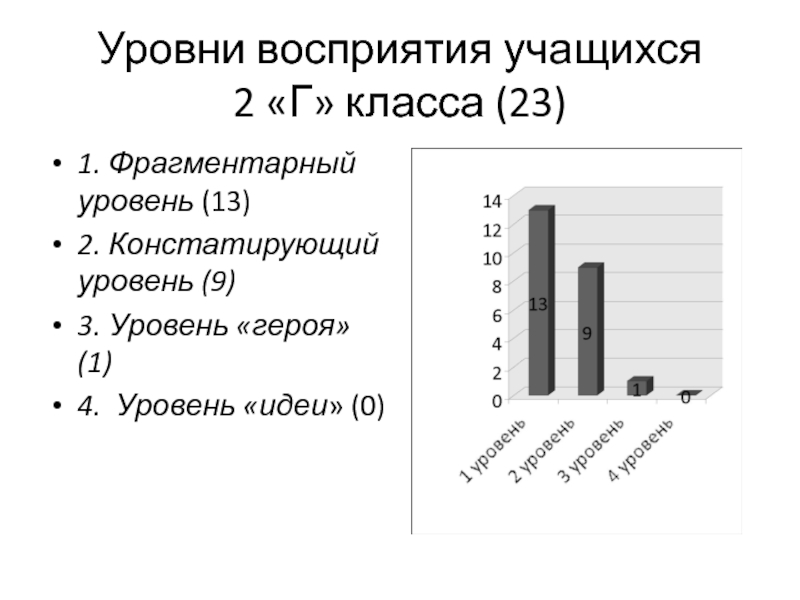 Уровни восприятия учащихся  2 «Г» класса (23)1. Фрагментарный уровень (13)2. Констатирующий уровень (9)3. Уровень «героя» (1)4.