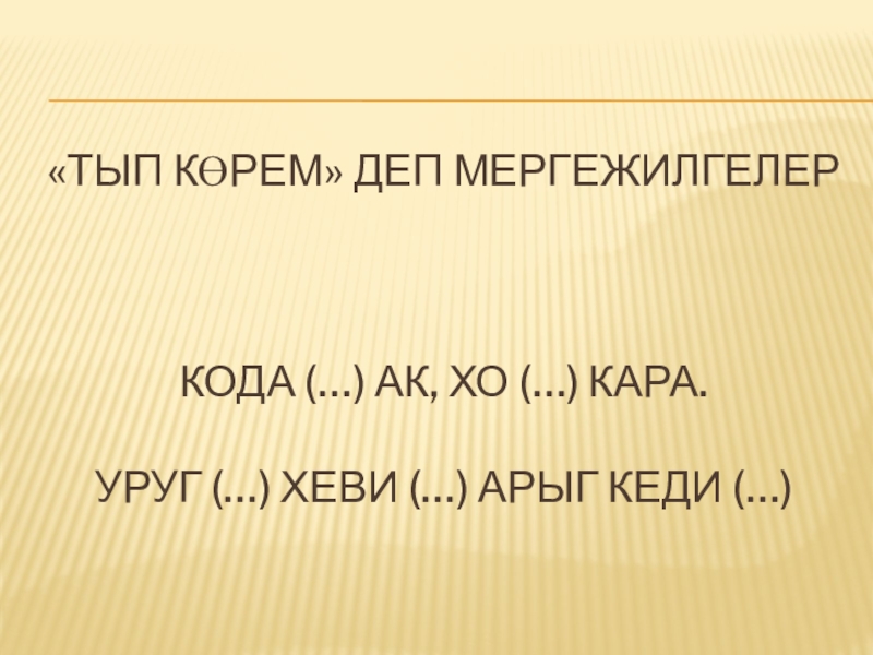 Слайд 12«Тып кƟрем» деп мергежилгелер кода (…) ак, хо (…) кара. Уруг (…) хеви