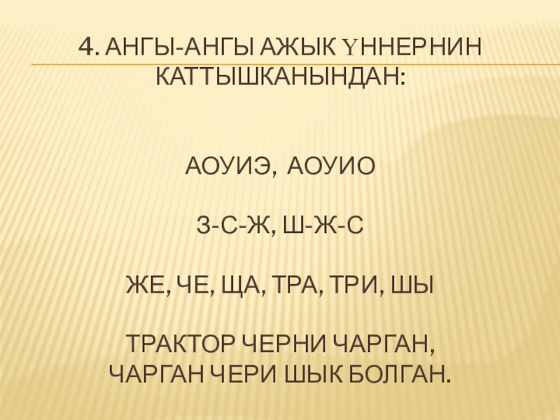 4. Ангы-ангы ажык yннернин каттышканындан:   аоуиэ, аоуио  з-с-ж, ш-ж-с  же, че, ща, тра,