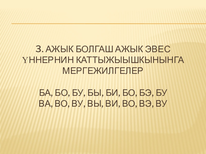 3. Ажык болгаш ажык эвес yннернин каттыжыышкынынга мергежилгелер  Ба, бо, бу, бы, би, бо, бэ, бу