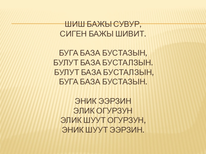 Слайд 6Шиш бажы сувур, сиген бажы шивит. Буга база бустазын, Булут база бусталзын. Булут база