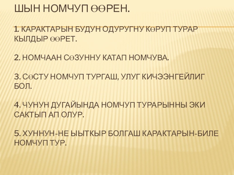 сƟзунну катап номчува. 3. СƟсту номчуп тургаш, улуг кичээнгейлиг бол. 4. Чунун дугайында номчуп турарынны эки сактып ап олур. 5. Хуннун-не ыыткыр болгаш карактарын-биле номчуп тур.