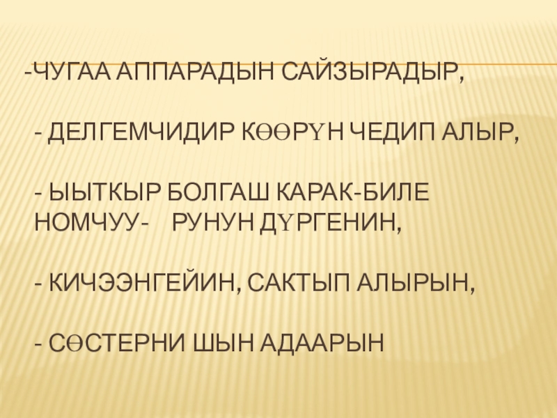 Слайд 2чугаа аппарадын сайзырадыр, - делгемчидир кƟƟрyн чедип алыр, - ыыткыр болгаш карак-биле номчуу-