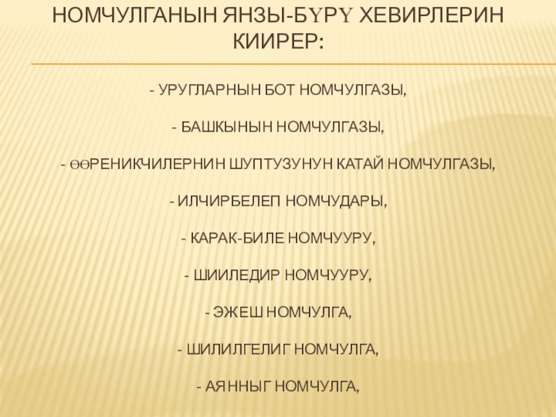 Слайд 3Номчулганын янзы-бyрy хевирлерин киирер: - уругларнын бот номчулгазы, - башкынын номчулгазы, - ƟƟреникчилернин шуптузунун
