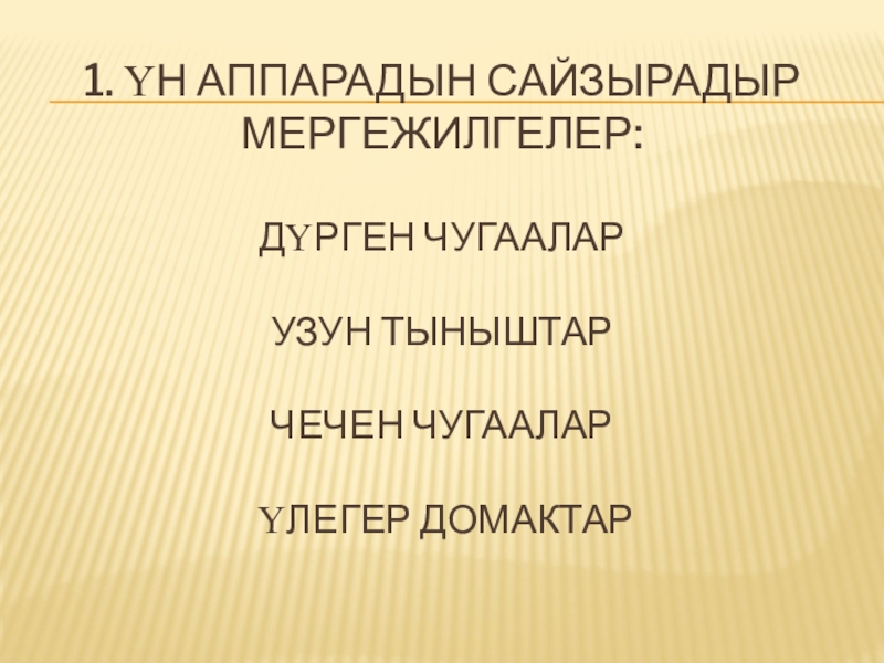 1. yн аппарадын сайзырадыр мергежилгелер:  дyрген чугаалар  узун тыныштар  чечен чугаалар   yлегер