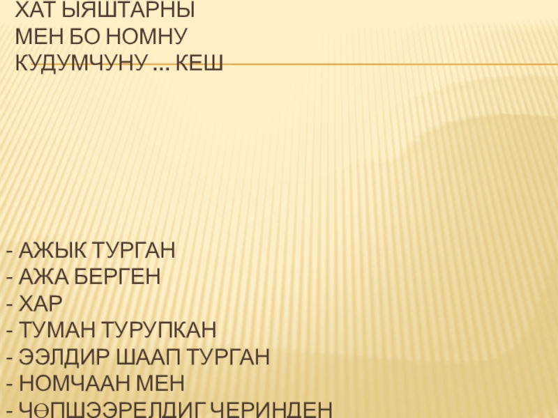 Слайд 13 Эжик шагда-ла хУн дем-не хунзедир …чагган хемнин кырында хат