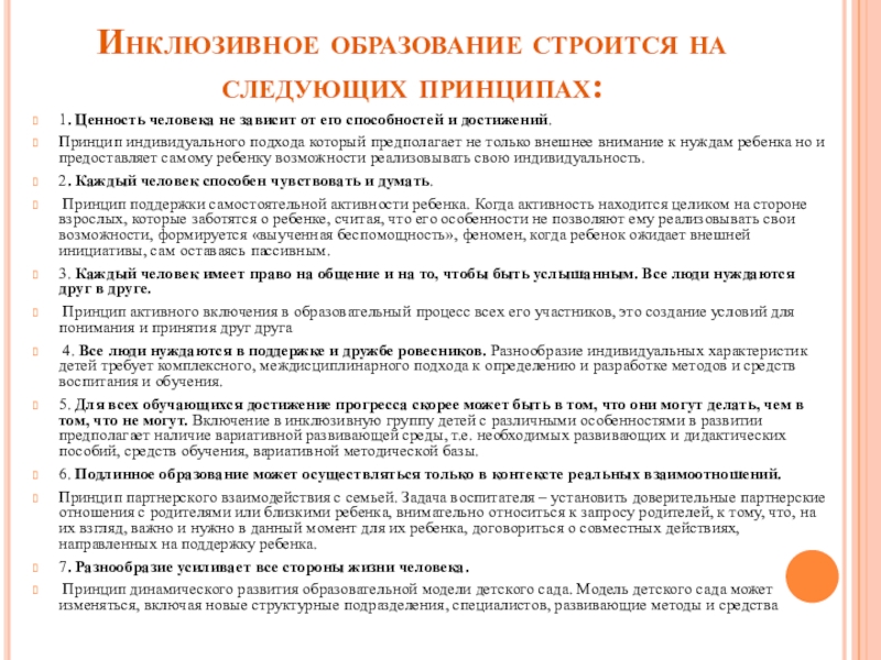 Слайд 3Инклюзивное образование строится на следующих принципах: