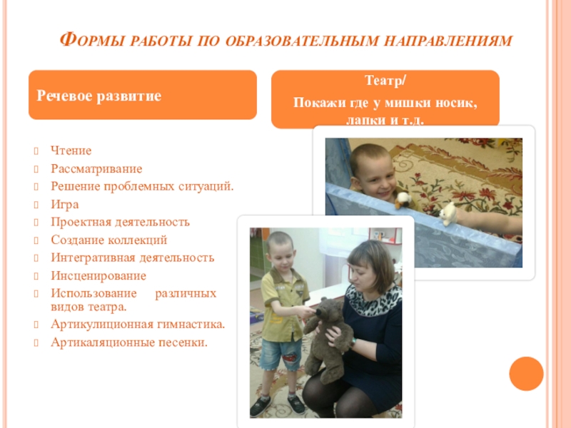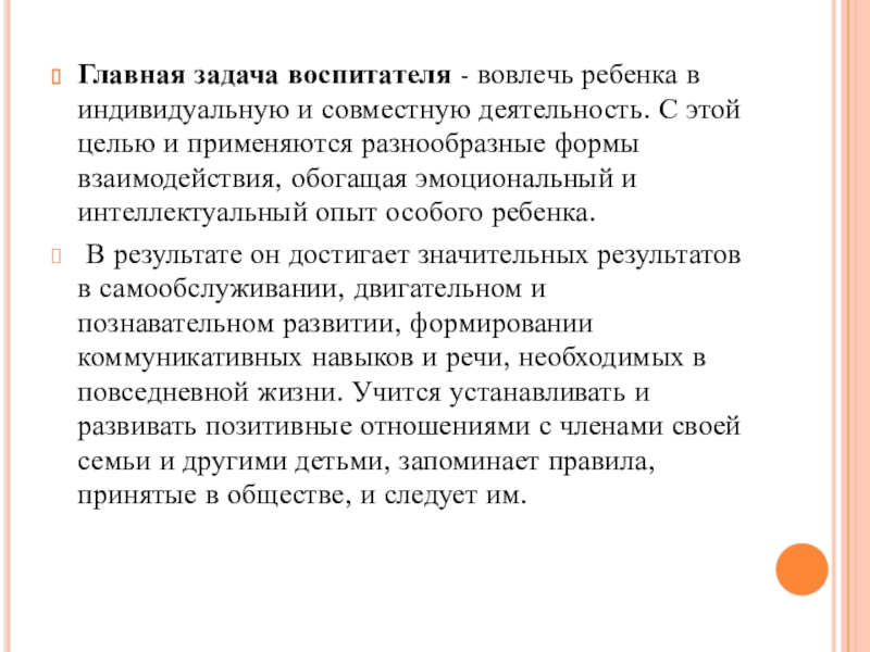 С этой целью и применяются разнообразные формы взаимодействия, обогащая эмоциональный и интеллектуальный опыт особого ребенка.
