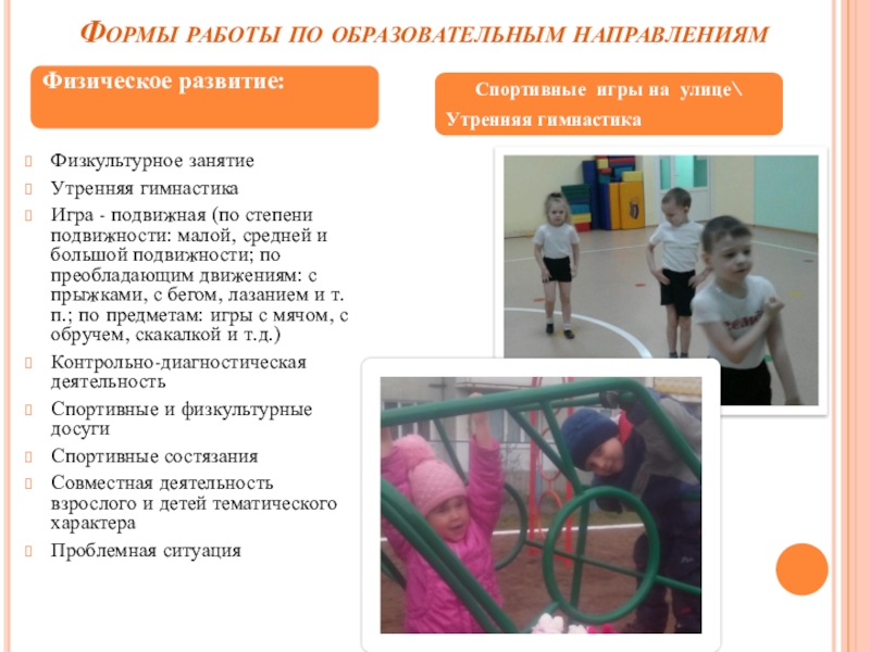 подвижности: малой, средней и большой подвижности; по преобладающим движениям: с прыжками, с бегом, лазанием и т.п.; по предметам: игры с мячом, с обручем, скакалкой и т.д.)