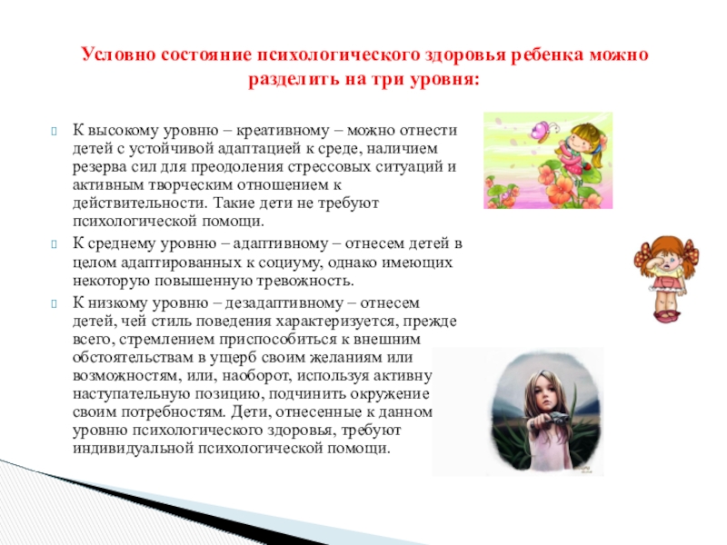 Условно состояние психологического здоровья ребенка можно разделить на три уровня: