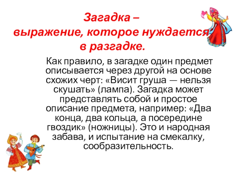 один предмет описывается через другой на основе схожих черт: «Висит груша — нельзя скушать» (лампа). Загадка может представлять собой и простое описание предмета, например: «Два конца, два кольца, а посередине гвоздик» (ножницы). Это и народная забава, и испытание на смекалку, сообразительность.