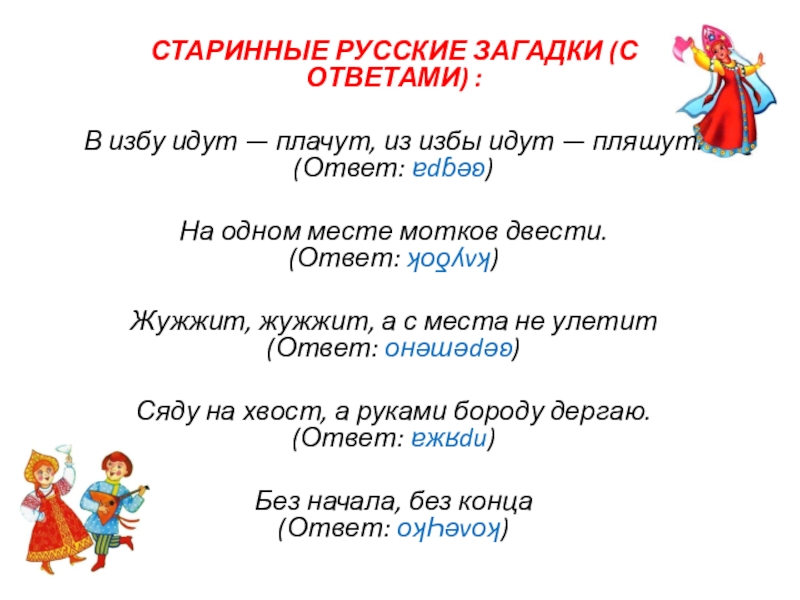 Слайд 24СТАРИННЫЕ РУССКИЕ ЗАГАДКИ (С ОТВЕТАМИ) :