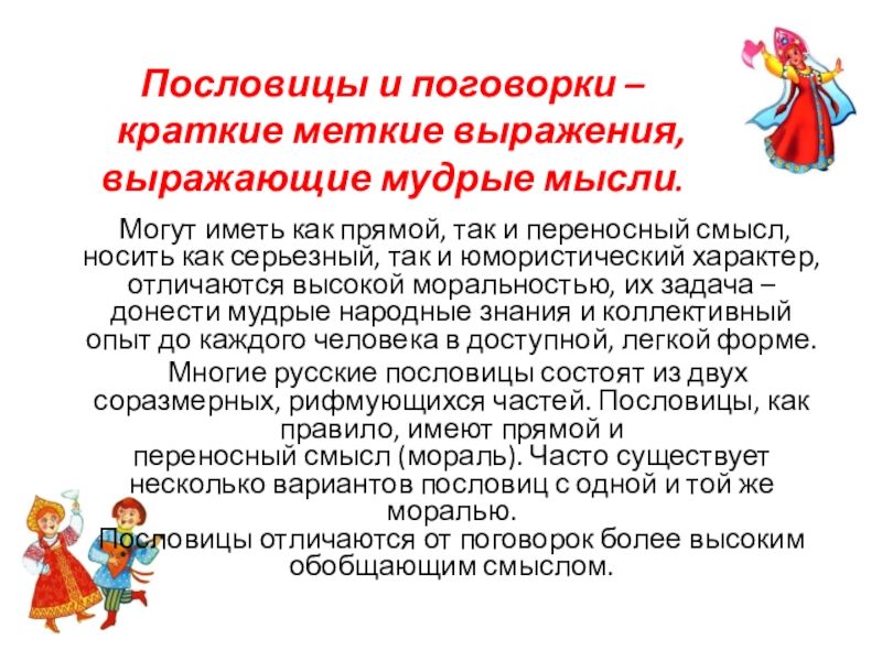 Могут иметь как прямой, так и переносный смысл, носить как серьезный, так и юмористический характер, отличаются высокой моральностью, их задача – донести мудрые народные знания и коллективный опыт до каждого человека в доступной, легкой форме.