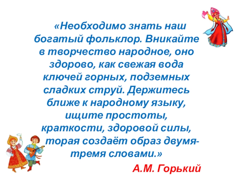 Слайд 25«Необходимо знать наш богатый фольклор. Вникайте в творчество народное, оно здорово,