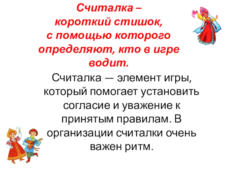 Считалка — элемент игры, который помогает установить согласие и уважение к принятым правилам. В организации считалки очень важен ритм.