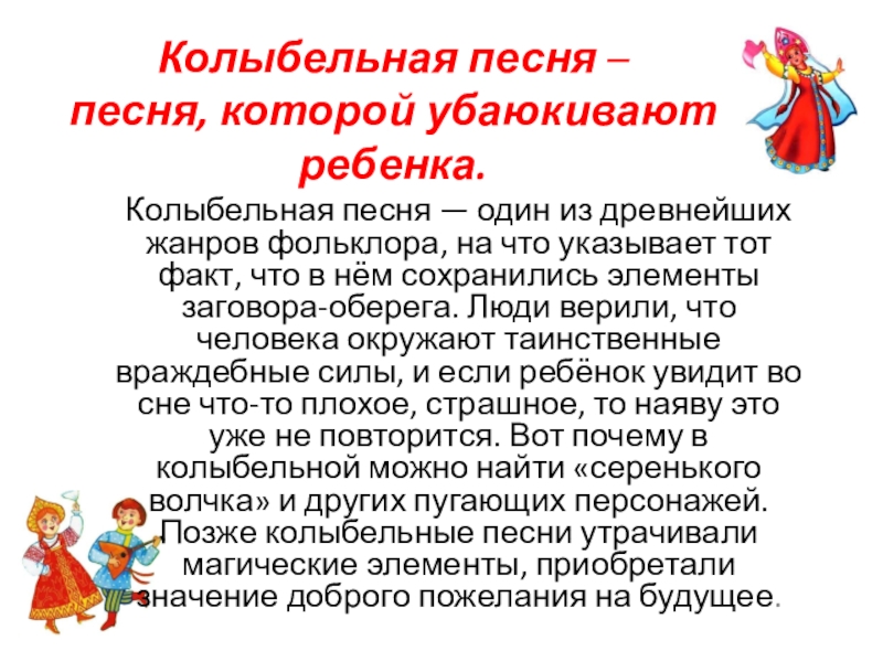 фольклора, на что указывает тот факт, что в нём сохранились элементы заговора-оберега. Люди верили, что человека окружают таинственные враждебные силы, и если ребёнок увидит во сне что-то плохое, страшное, то наяву это уже не повторится. Вот почему в колыбельной можно найти «серенького волчка» и других пугающих персонажей. Позже колыбельные песни утрачивали магические элементы, приобретали значение доброго пожелания на будущее.