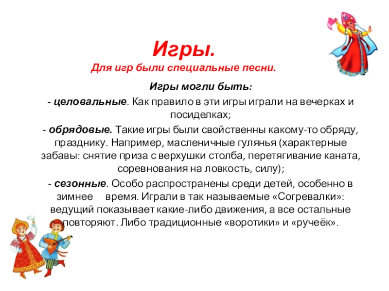 - сезонные. Особо распространены среди детей, особенно в зимнее время. Играли в так называемые «Согревалки»: ведущий показывает какие-либо движения, а все остальные повторяют. Либо традиционные «воротики» и «ручеёк».