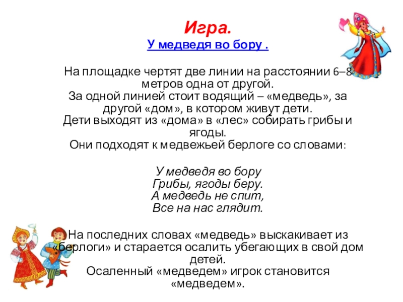 На последних словах «медведь» выскакивает из «берлоги» и старается осалить убегающих в свой дом детей.
