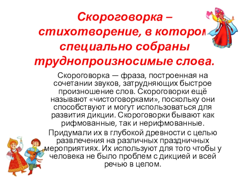 сочетании звуков, затрудняющих быстрое произношение слов. Скороговорки ещё называют «чистоговорками», поскольку они способствуют и могут использоваться для развития дикции. Скороговорки бывают как рифмованные, так и нерифмованные.