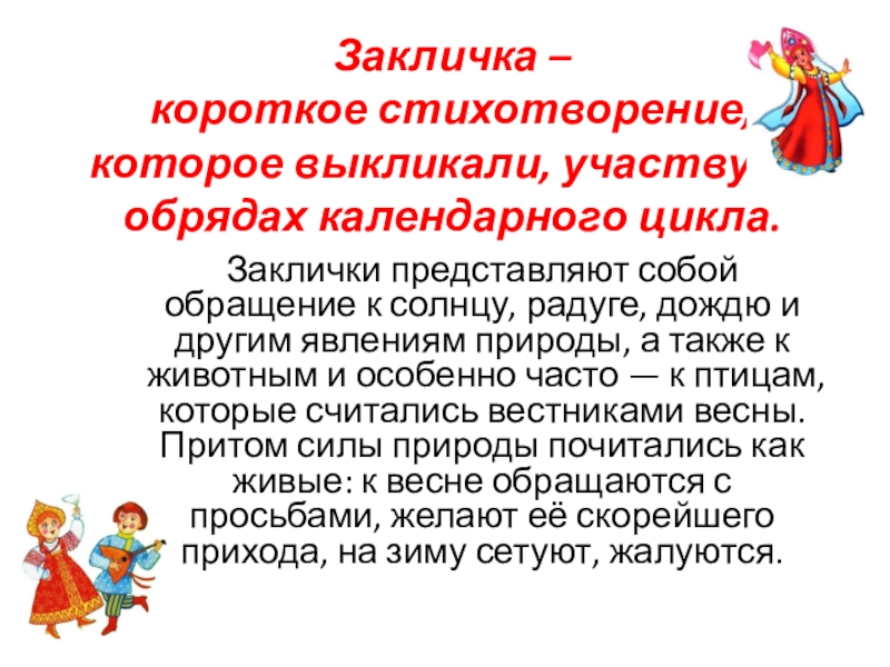 собой обращение к солнцу, радуге, дождю и другим явлениям природы, а также к животным и особенно часто — к птицам, которые считались вестниками весны. Притом силы природы почитались как живые: к весне обращаются с просьбами, желают её скорейшего прихода, на зиму сетуют, жалуются.