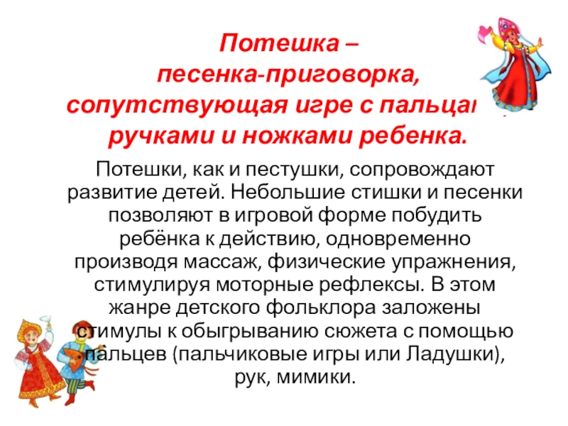 как и пестушки, сопровождают развитие детей. Небольшие стишки и песенки позволяют в игровой форме побудить ребёнка к действию, одновременно производя массаж, физические упражнения, стимулируя моторные рефлексы. В этом жанре детского фольклора заложены стимулы к обыгрыванию сюжета с помощью пальцев (пальчиковые игры или Ладушки), рук, мимики.