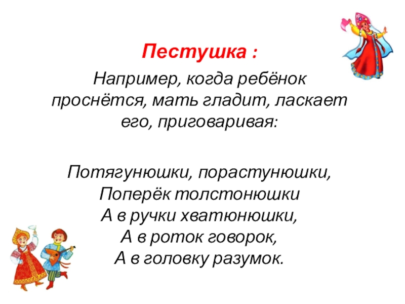 Например, когда ребёнок проснётся, мать гладит, ласкает его, приговаривая:
