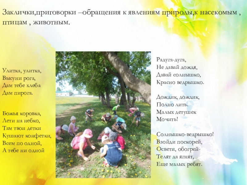 Заклички,приговорки –обращения к явлениям природы,к насекомым ,птицам , животным.